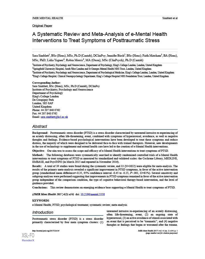 The aim of this meta-analysis was to assess the scope and efficacy of e-Mental Health interventions to treat symptoms of PTSD. The review demonstrates an emerging evidence base supporting e-Mental Health to treat symptoms of PTSD.