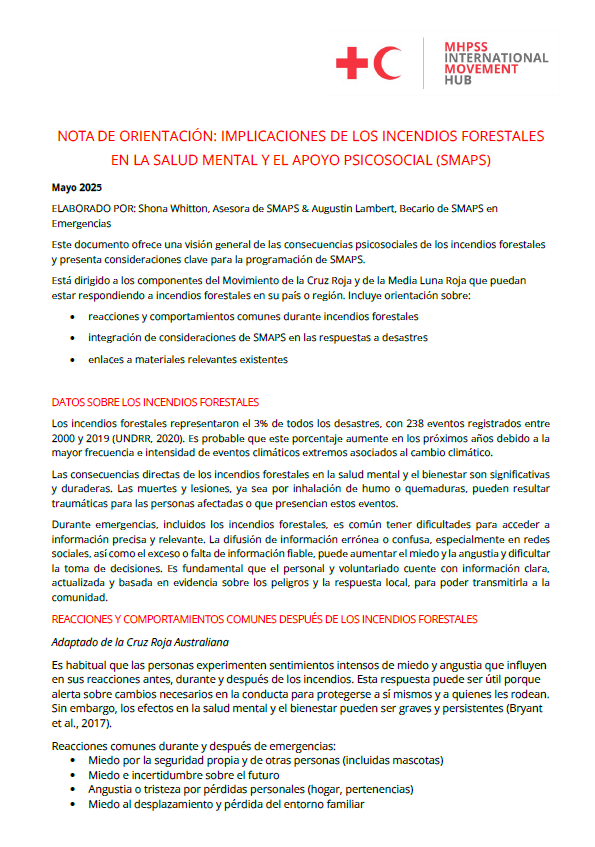 This guidance note is intended for Red Cross Red Crescent Movement components who may be responding to wildfires in their country, or region. It includes guidance on: