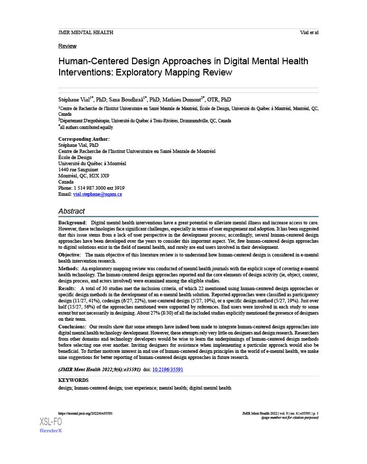 The main objective of this literature review was to understand how human-centered design is considered in e-mental health intervention research. The exploratory mapping review shows that some attempts have indeed been made to integrate human-centered design approaches into digital mental health technology development. However, these attempts rely very little on designers and design research. To further motivate interest in and use of human-centered design principles in the world of e-mental health, the authors presents nine suggestions for better reporting of human-centered design approaches in future research.