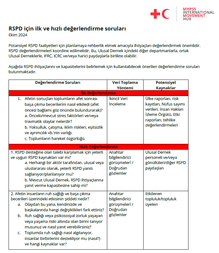 It is important to assess needs to guide planning for potential MHPSS activities. MHPSS assessments should be coordinated. This may include with other departments within the National Society, with partner National Societies, the IFRC, the ICRC and/ or with external stakeholders. The following are suggested assessment questions that can be used to determine MHPSS needs and