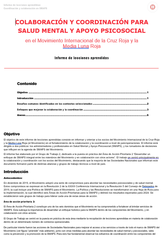This report serves as a guidance tool for Movement partners to enhance teamwork and coordination at country and operational levels. The lessons presented in the report are the result of a collaborative effort by National Societies actively engaged in a working group dedicated to supporting the implementation of priority action area (PAA) 2 of the MHPSS Roadmap: Develop a holistic MHPSS approach between Movement components and in collaboration with other actors.