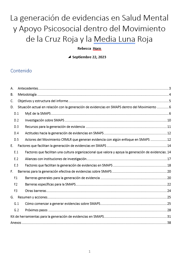 In this comprehensive report, Rebecca Horn, Mental Health and Psychosocial Support Specialist, records the results of the consultancy project, which aimed to identify the MHPSS evidence-building activities taking place within the Movement, the common barriers and challenges as well as factors supporting evidence-building activities. In addition, an MHPSS Evidence-Building Toolkit and Repository have been published alongside the findings and include an array of tools and resources to overcome common barriers and challenges.