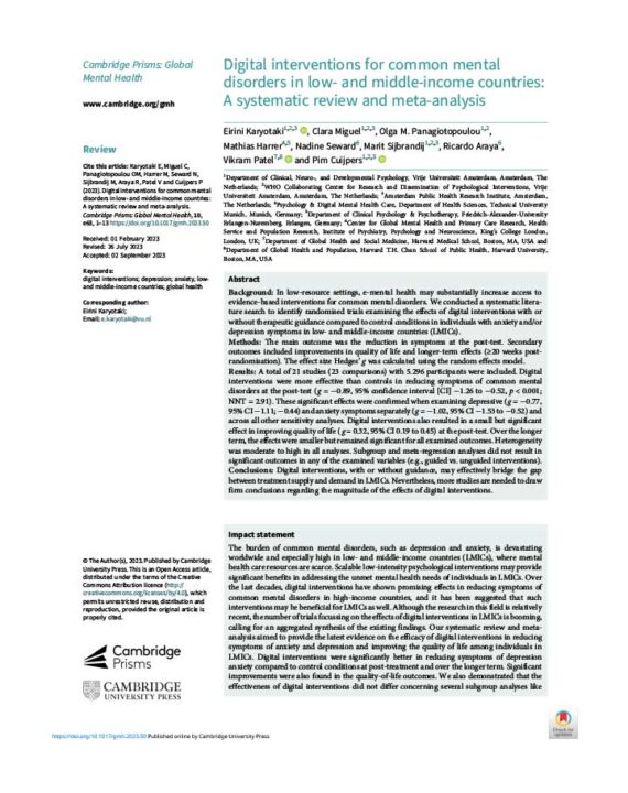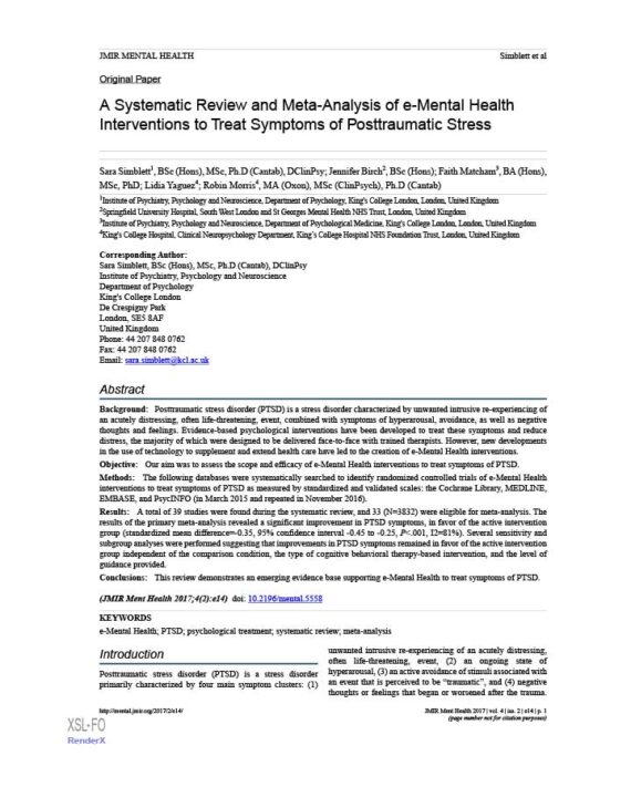 This scoping review aims to map existing digital mental health interventions relevant for children and adolescents affected by war. The authors conclude that there is very limited evidence for the use of digital mental health interventions for this target groups at present.The review provides a framework to inform the development of new interventions.